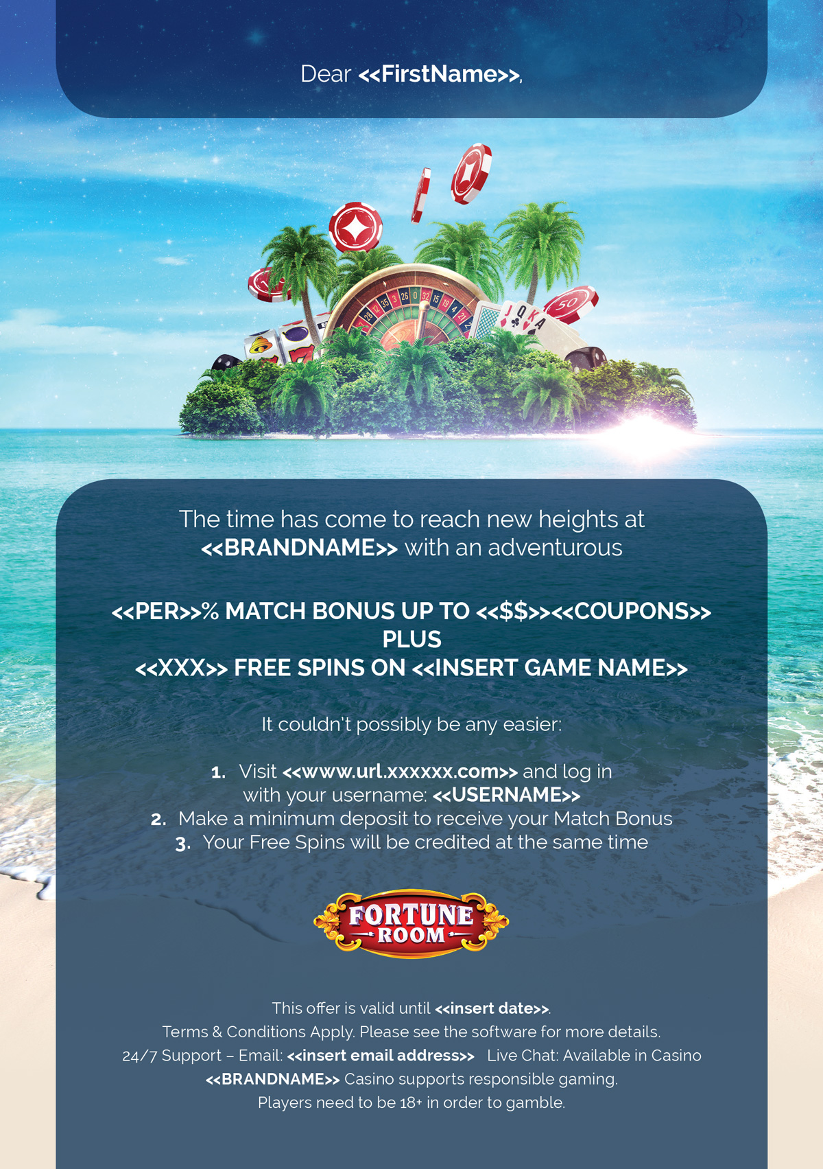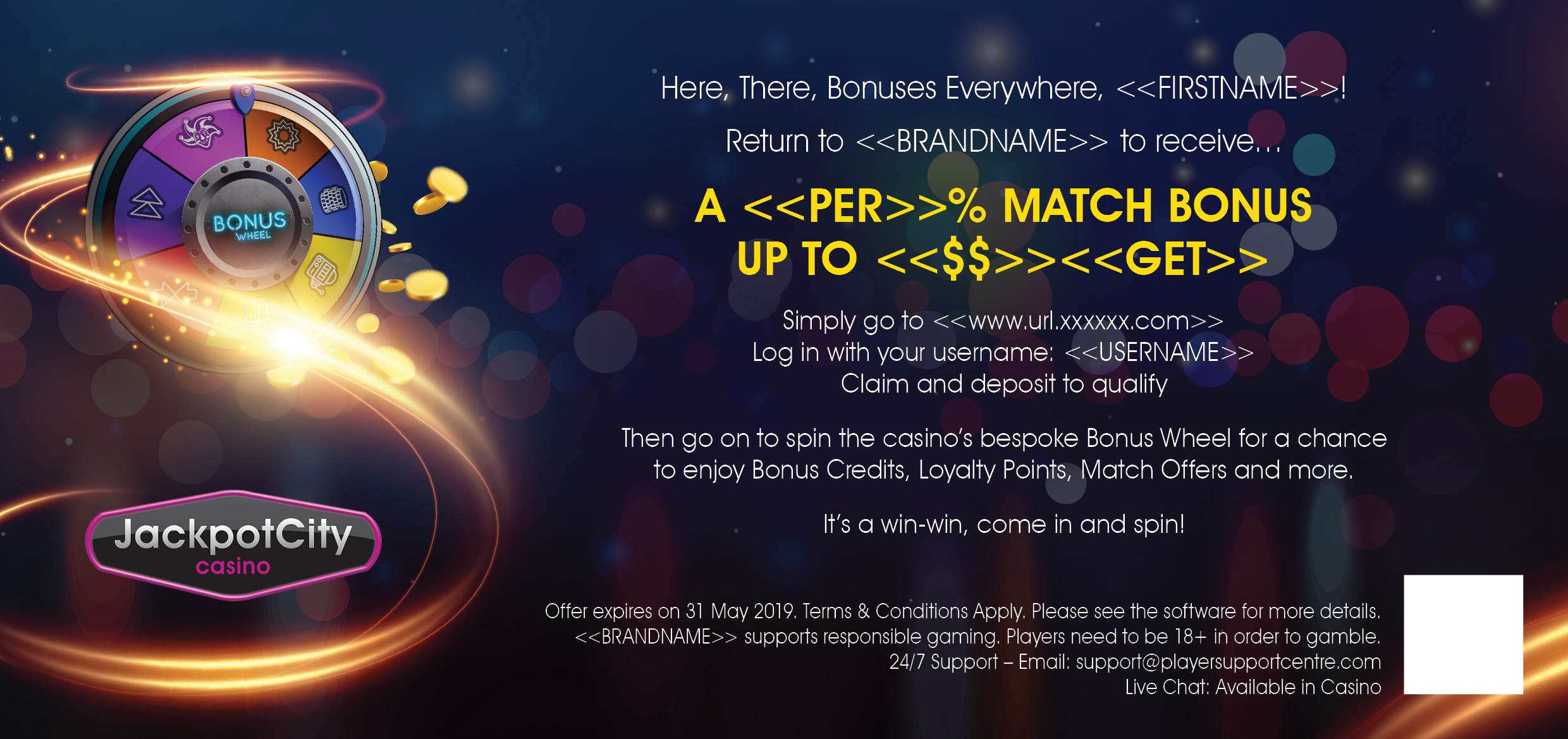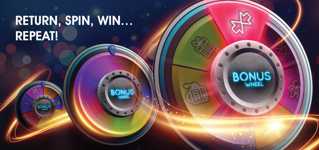 The following direct mailer communicated to the client the implementation of the Bonus Wheel within the lobby space and invited them to experience its exciting features. A DL double-sided design printed on thick stock.
