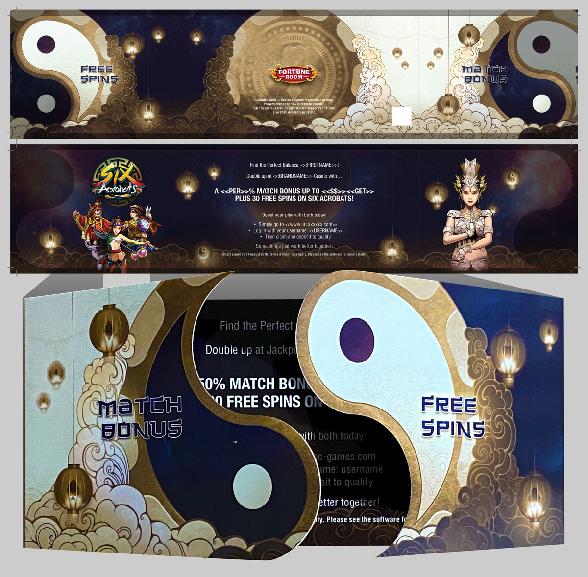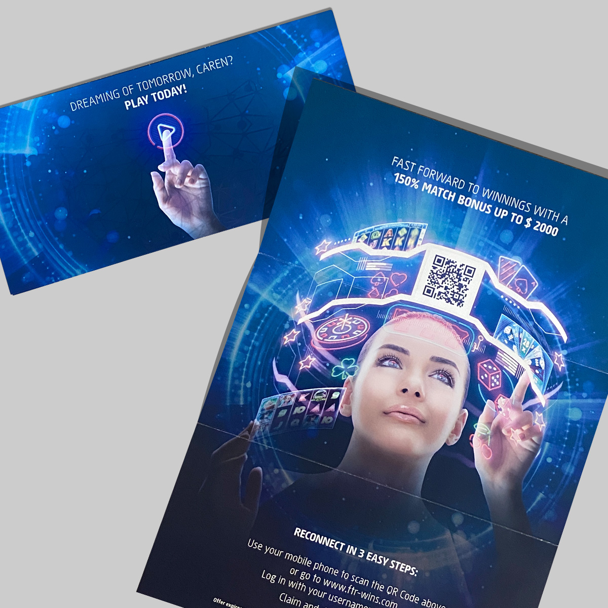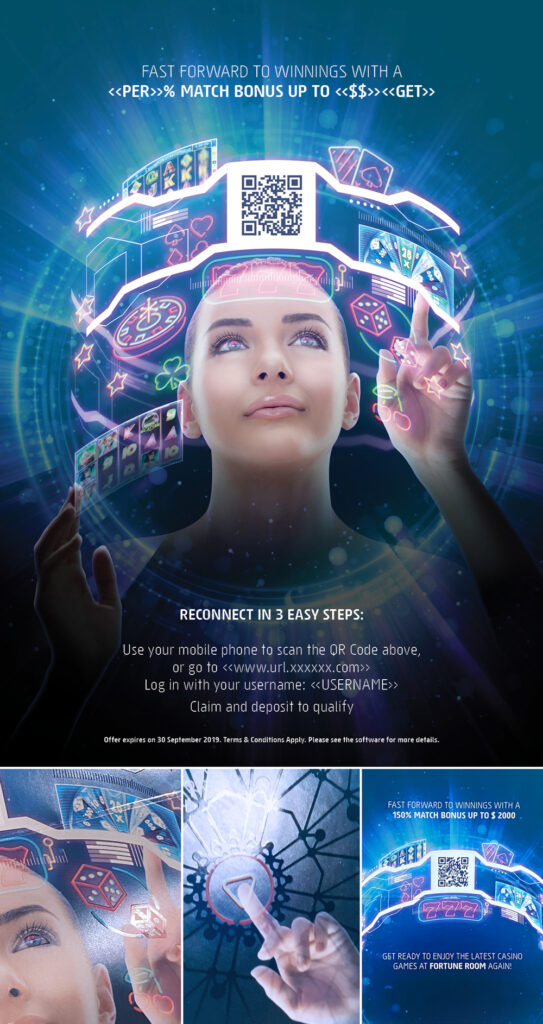The offline direct send, targeted towards Lapsed Players and themed “Virtual Reality,” invited users to scan a QR code that redirected them to the corresponding Casino’s landing page. To balance cost-effectiveness and aesthetic appeal, I opted for a matt print with a touch of ingenuity. Utilizing UV varnish, I highlighted specific elements in the design, introducing subtle “ghost” elements that become visible when the printed pamphlet is moved, and light reflects off the varnished parts. This approach allowed us to maintain a captivating design while keeping print costs in check.